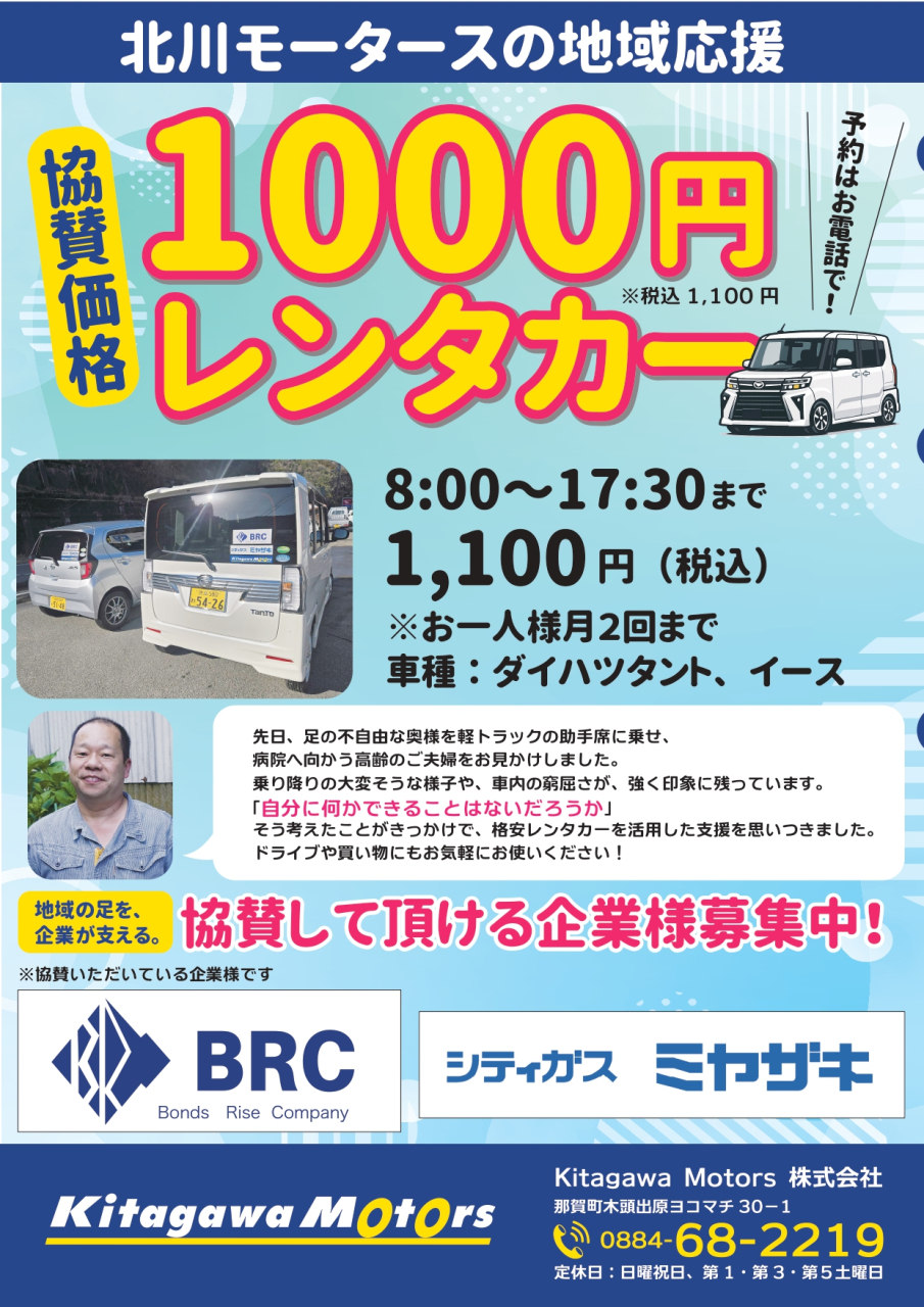 この度、株式会社BRC様と宮崎商事株式会社様のご協賛をいただき、1000円レンタカーを始めることになりました。